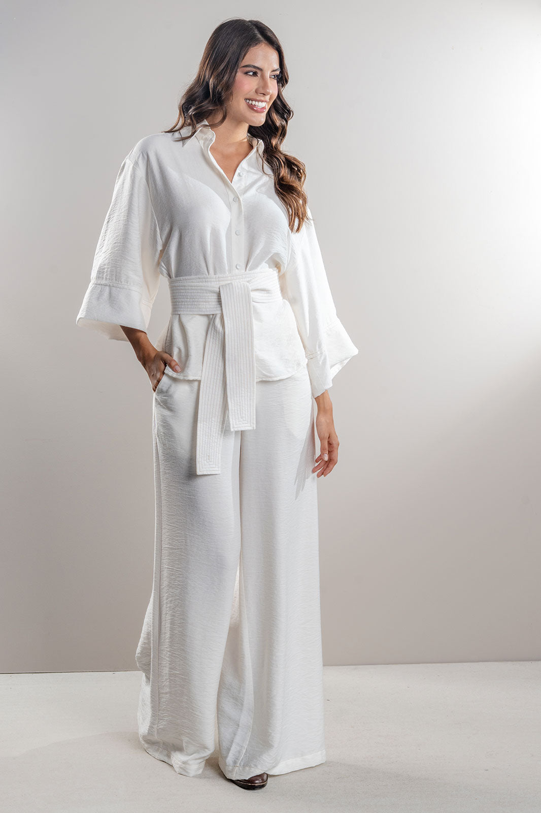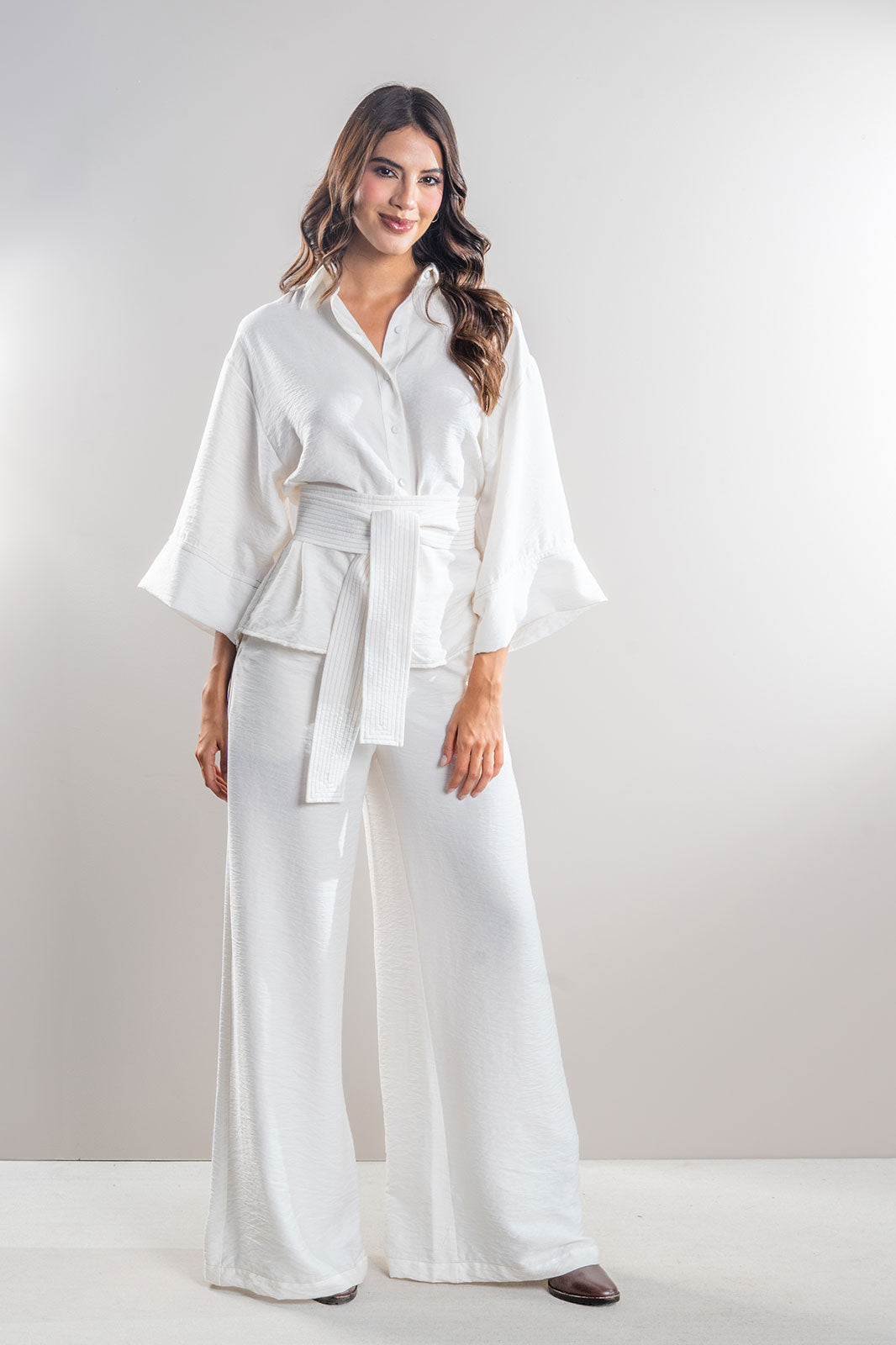 Blusa camisera Artisana con cinturón 70% Rayon 30% Lino