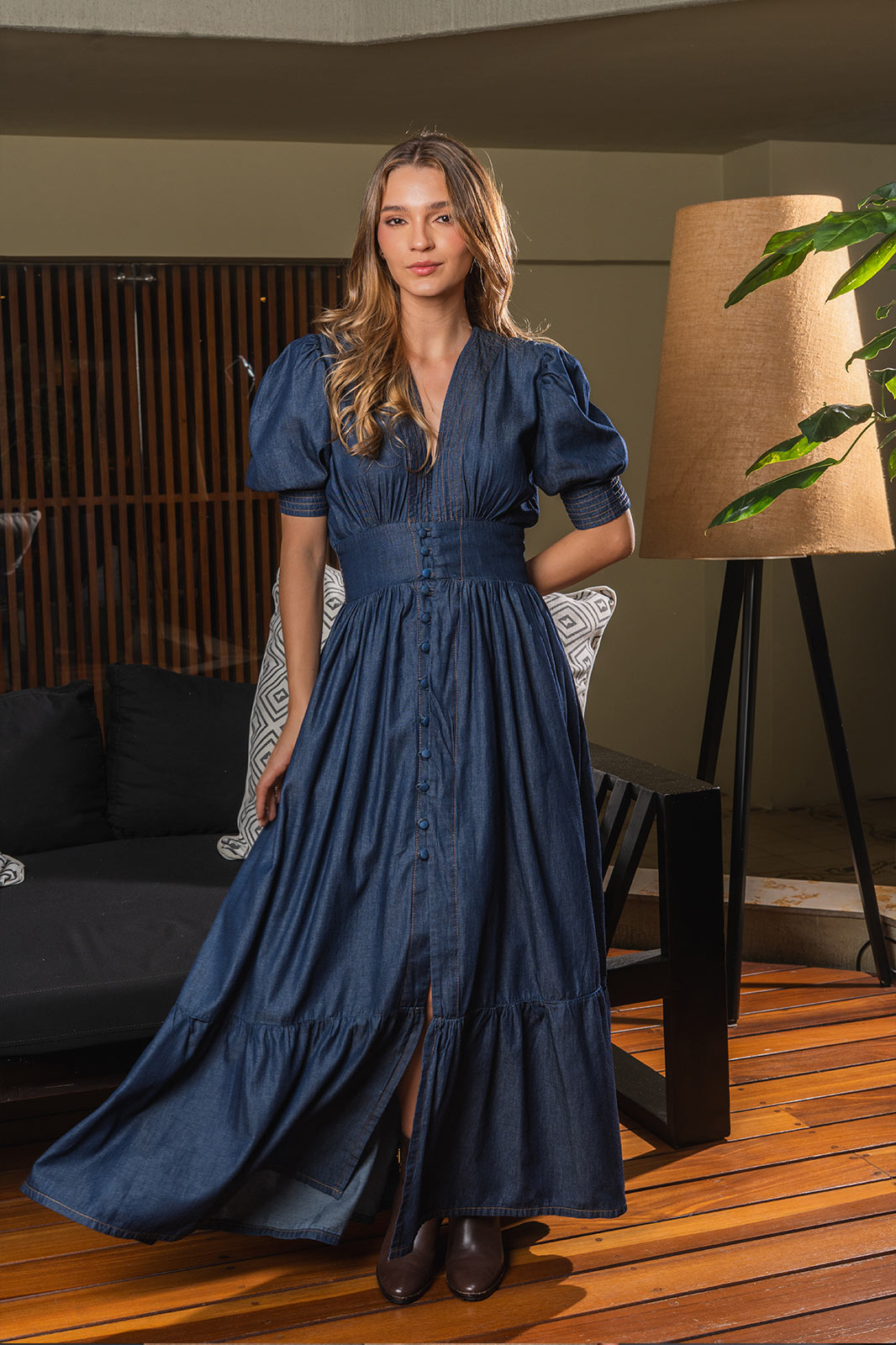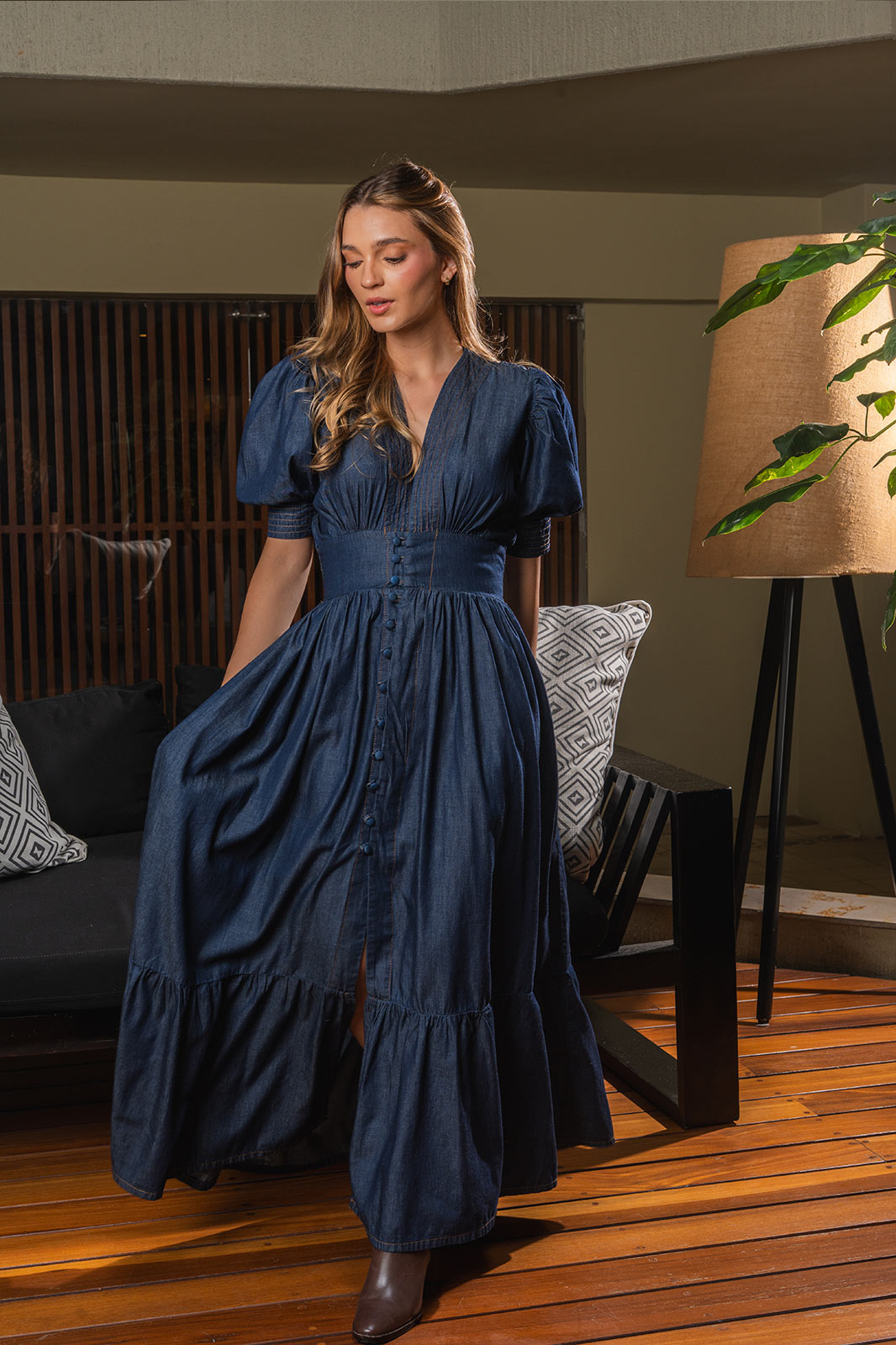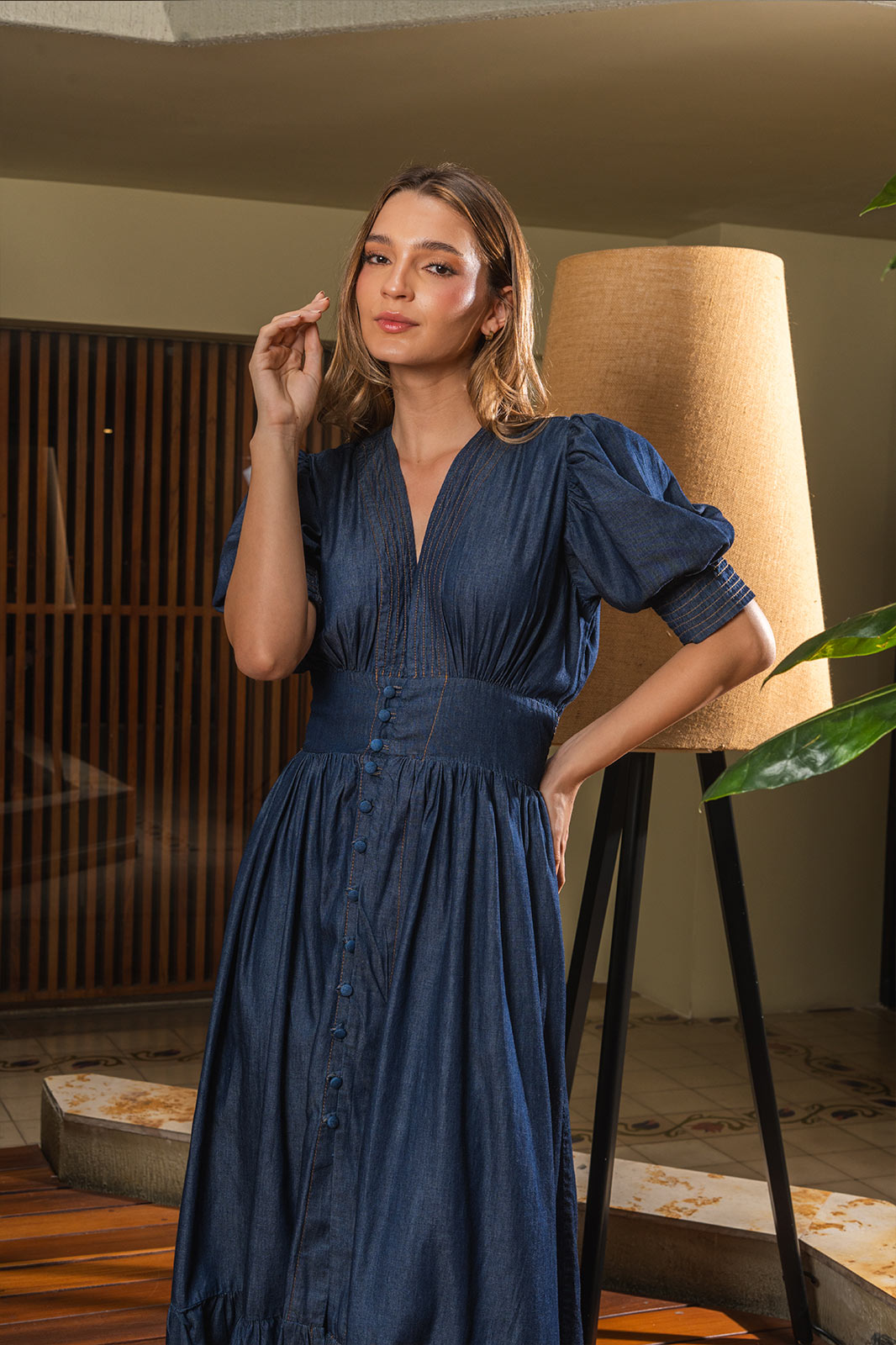 Vestido cuello V con botonadura en frente, manga corta bombacha