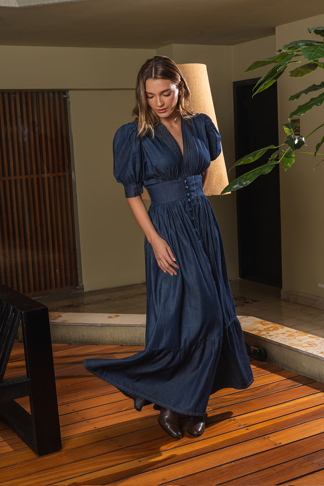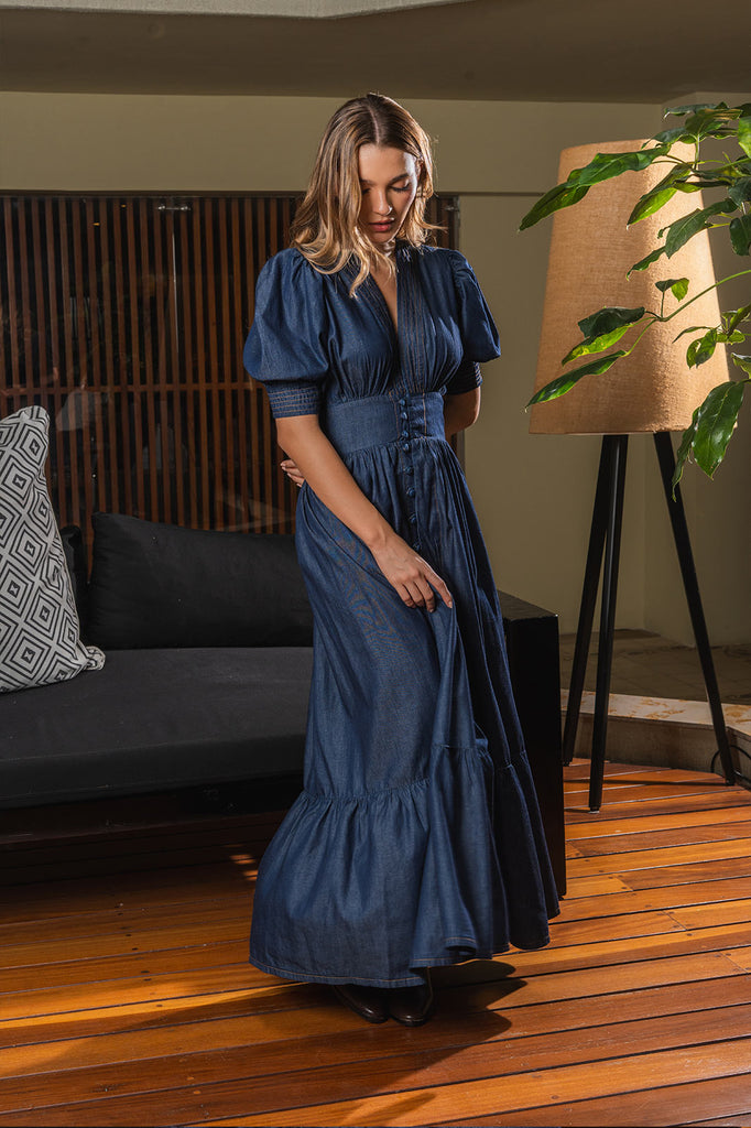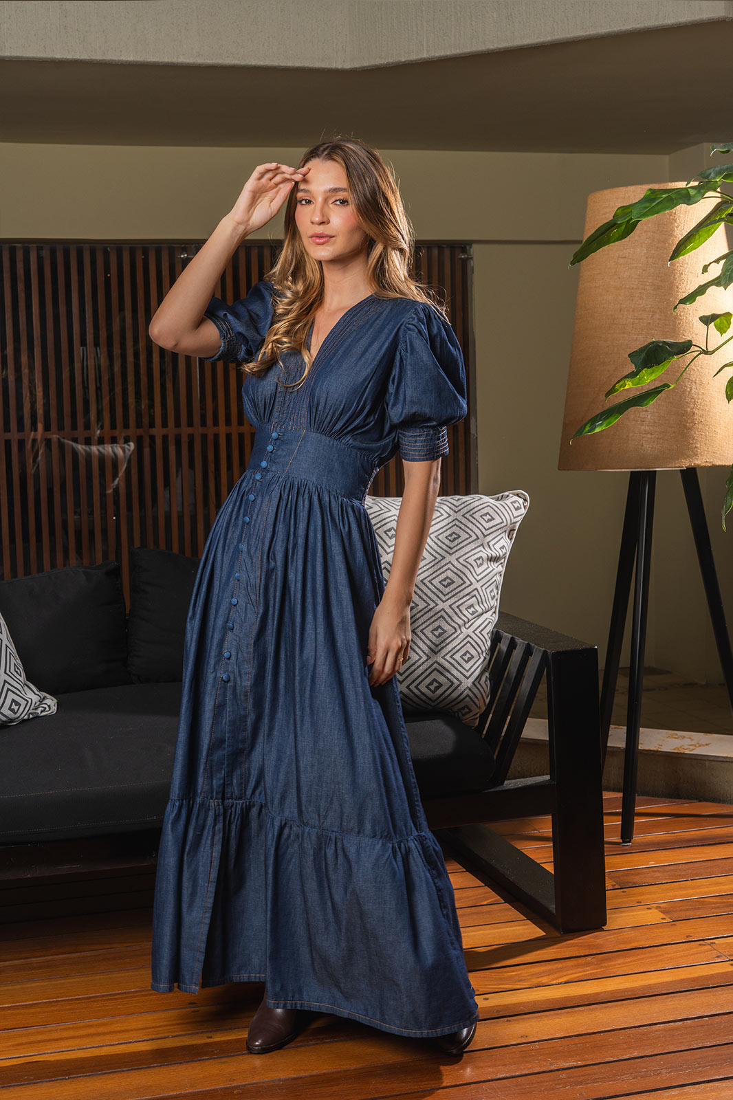 Vestido cuello V con botonadura en frente, manga corta bombacha