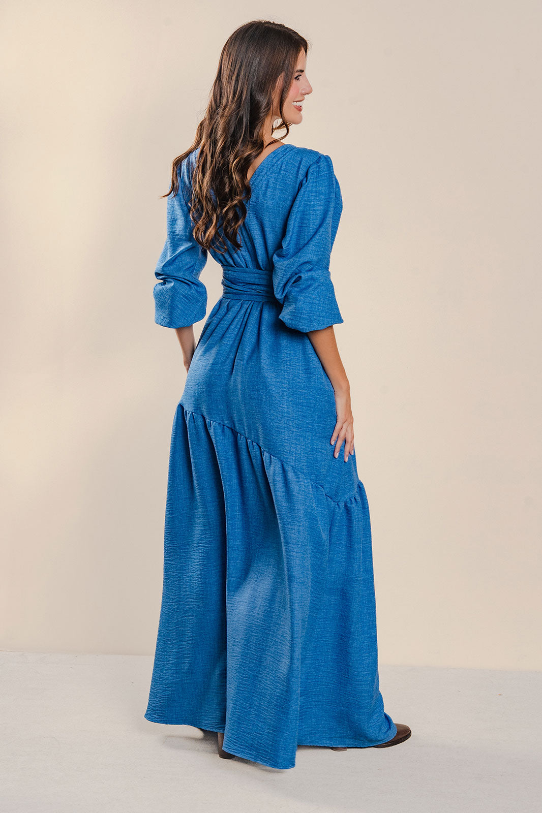 Vestido  largo cuello V, manga larga,, con cinturón